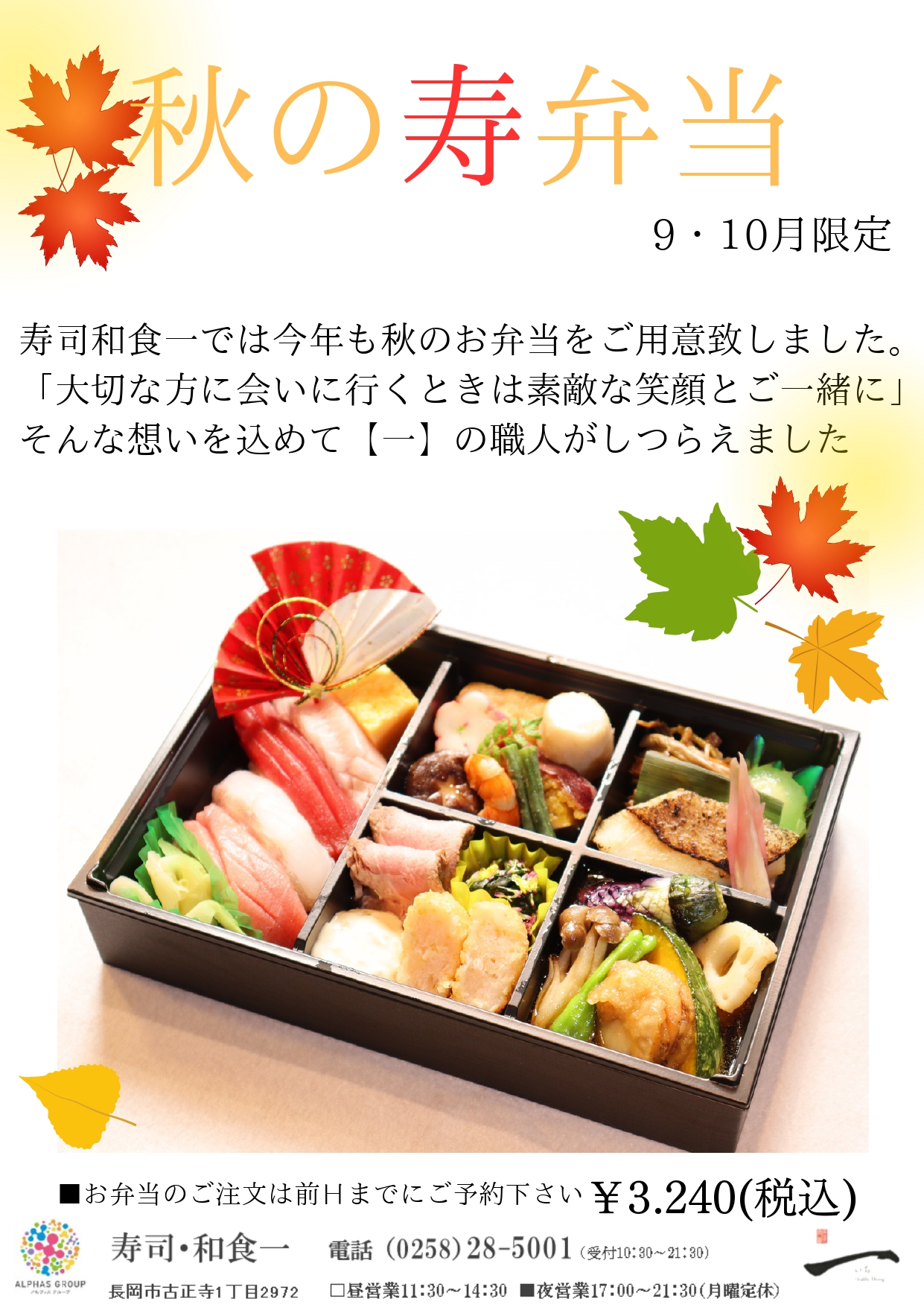 寿司・和食「一」『秋の寿弁当』販売開始のご案内 2023.09.04 お知らせ食事業 寿司・和食一では9月、10月限定で「秋の寿弁当」を販売致します。 「大切な方に会いに行くときは素敵な笑顔とご一緒に」 ご注文は前日まで、お電話にて承ります。 0258-28-5001(10:30~※月曜定休) 寿司・和食 一 ホームページ