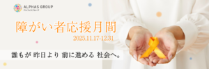 アルファスグループはこの日を中心に、11月17日~12月31日を「障がい者応援月間」と称して、地域の方が障がいのある方が抱える問題を考えるきっかけにしてもらえるように社内外へ発信していきます。