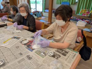 バスボムづくりでは、ご利用者様と一緒に色や香りを選びながら制作し、完成したバスボムを使ってより一層リラックスした入浴時間をお楽しみいただいています。